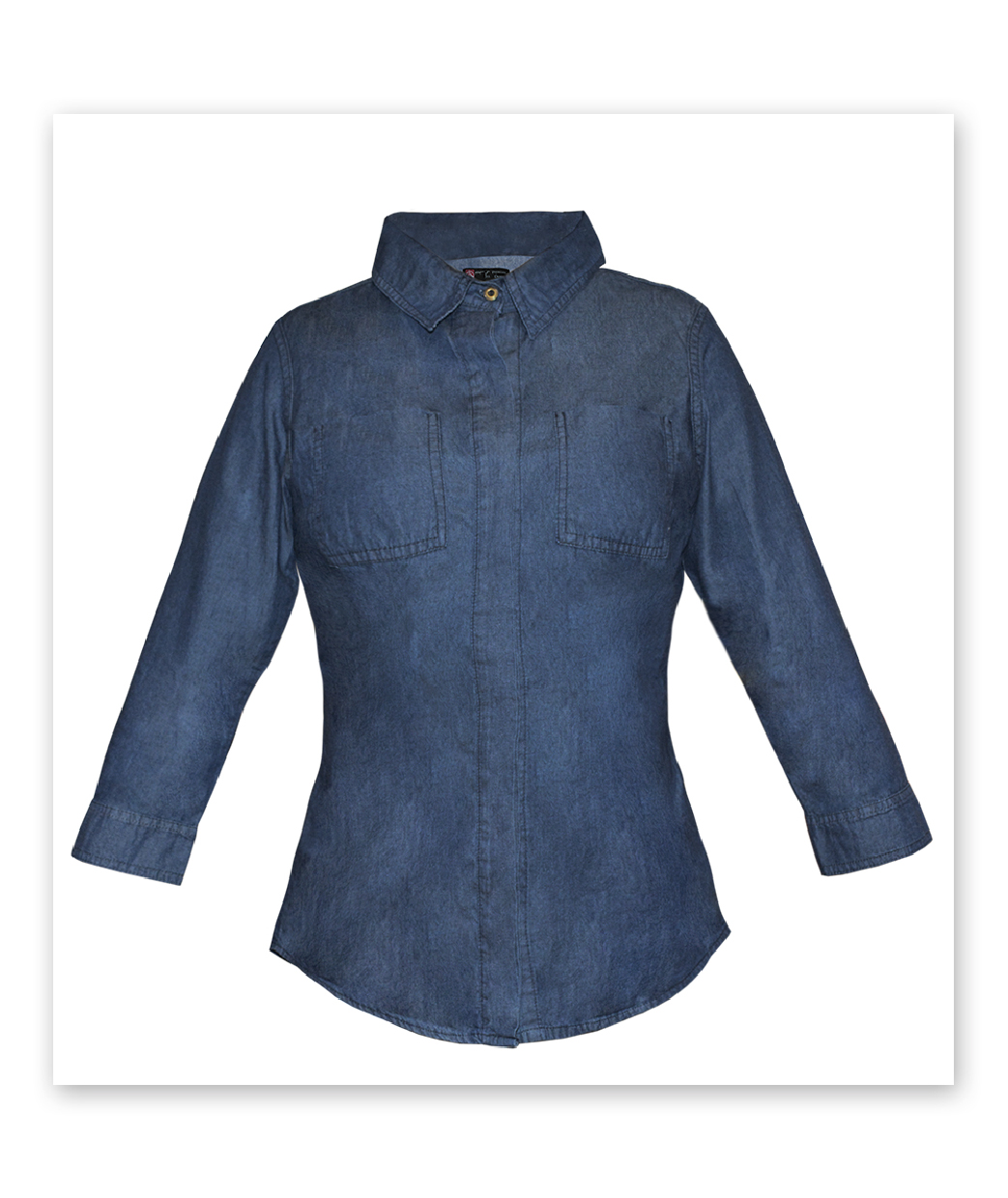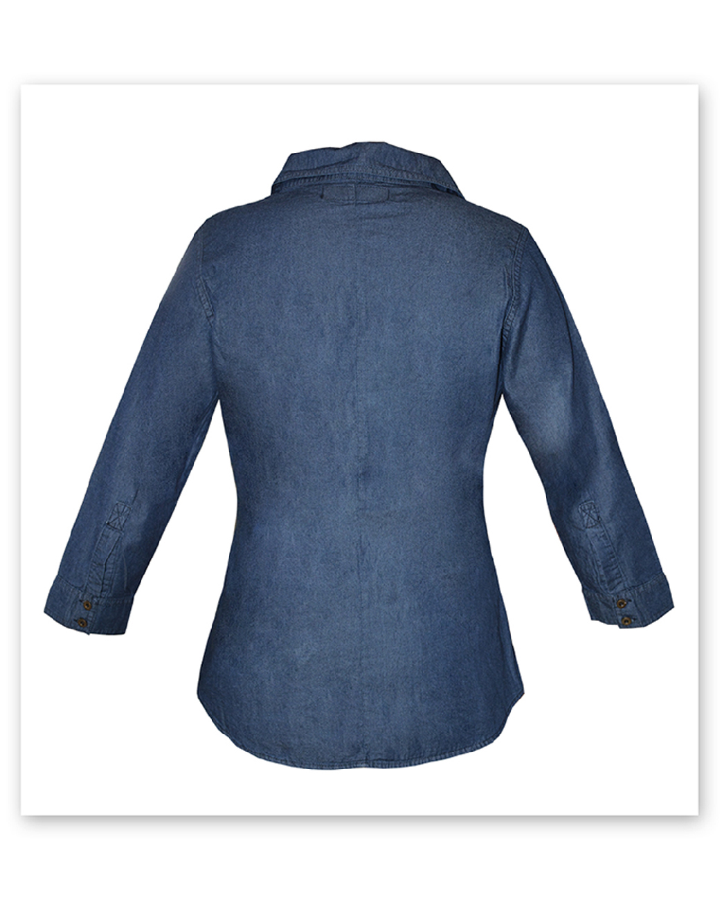 BLUSA DE MEZCLILLA CON BOLSAS FUNCIOLANES Y MANGAS A TRES CUARTOS